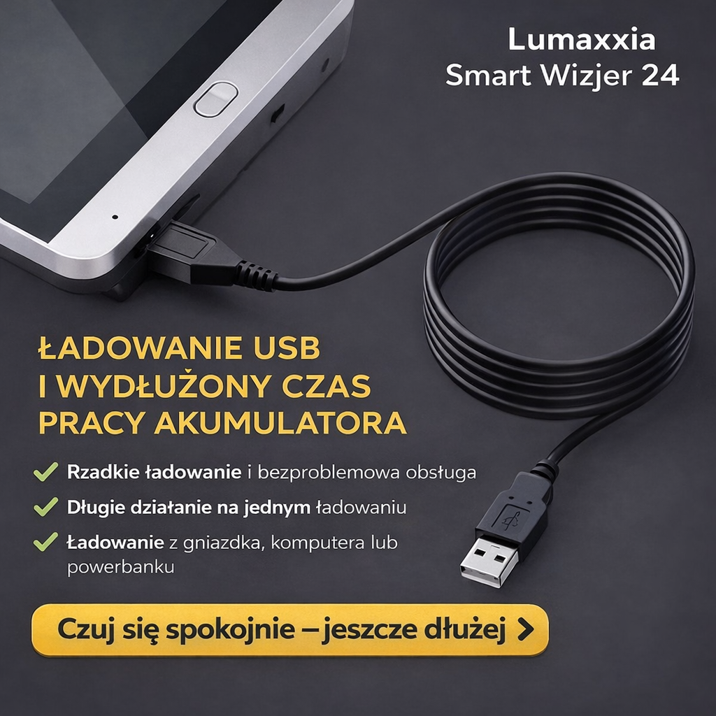 Pojemna bateria 5000 mAh wystarcza na ponad trzy tygodnie pracy. Gdy poziom energii spada, wizjer sam przypomina o ładowaniu przez USB — bez przerw i bez stresu.